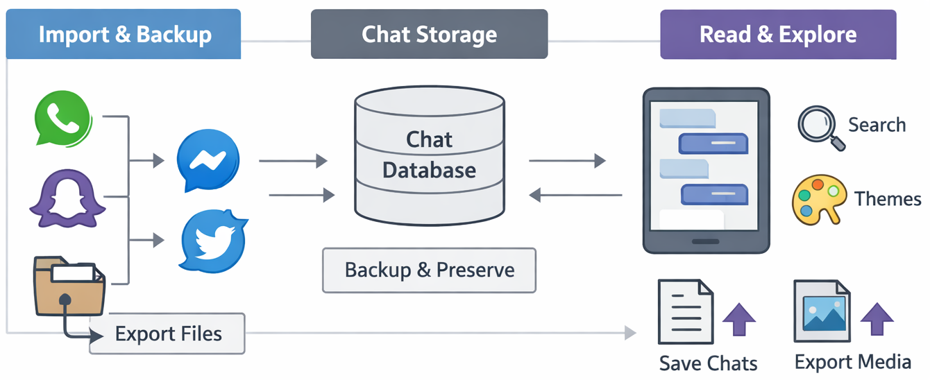 On top of that sits the Chat Reader UI, rendering chats in a familiar messenger-like interface. It supports text, emojis, images, timestamps, and even basic theme customization.